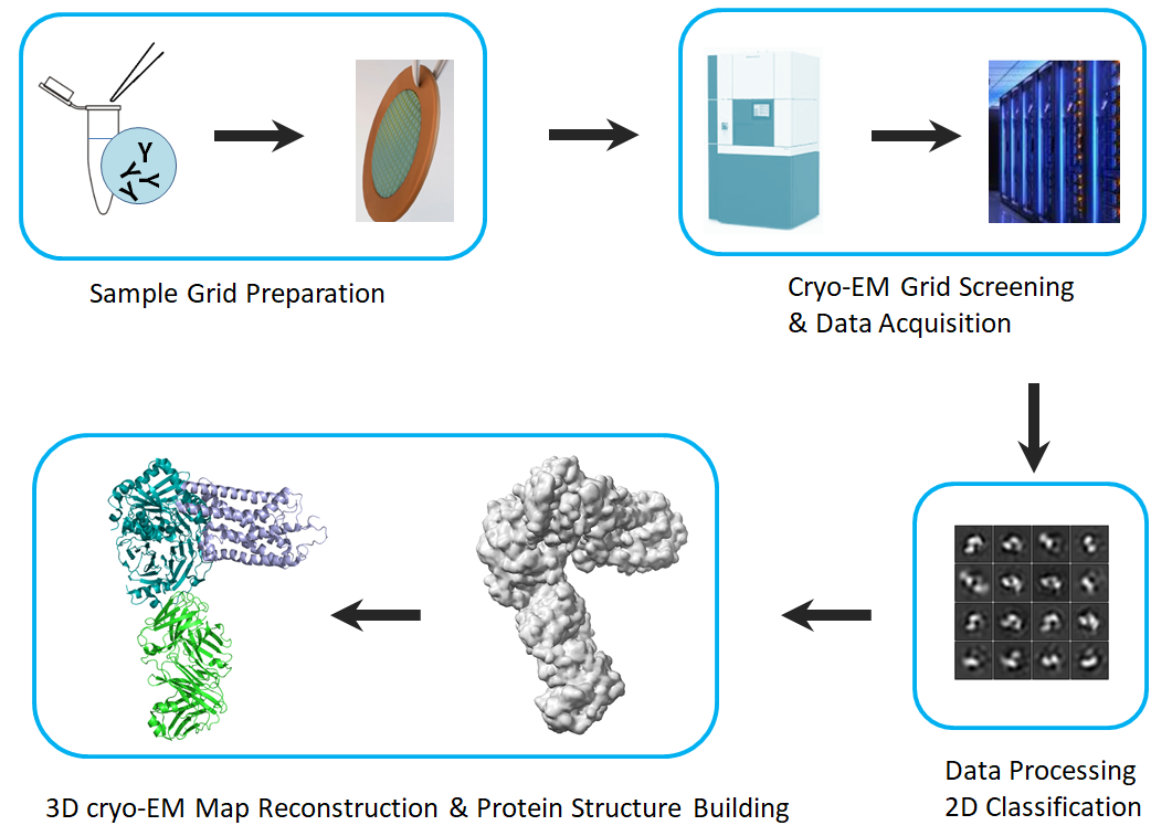 The use of rigidified antibody formats makes our NovoAb-EM technology well-suited for antibody binding characterization and validating AI-designed antibodies. 3D epitope mapping and paratope mapping for antibody-antigen complexes can be done simutaneously in one experiment, with both single amino acid and atomic resolution. NovoAb-EM integrates modern biochemistry, automation, the most advanced hardware and software, and AI-powered image processing into a solution which can facilitate high-resolution structural characterization for even the most challenging targets, from very small proteins to large and complex protein assemblies. Samples are optimized, flash frozen in a wide range of naturally occurring conditions, and then used to collect hundreds of thousands of cryo-EM images and build precise empirical 3D structure models.