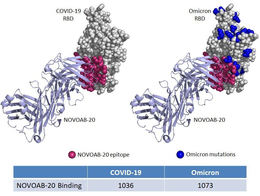 The Omicron variant has caused complete loss of or dramatically reduced activity of several therapeutic antibodies developed against the original COVID-19. This is not surprising because the binding sites (epitope) of these mAbs are all located in the mutated region of Omicron. In contrast to these mAbs, we just found that NOVOAB-20’s binding activity remains the same (a little stronger), thanks to its highly conserved epitope (red). None of the fifteen RBD mutations of Omicron (blue) are in the epitope of this antibody. This highlights the crucial importance of detailed epitope evaluation when selecting drug candidates for antibody therapeutics development, especially for those targets that are constantly mutating.